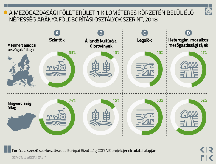A kutatás azt vizsgálta meg, hogy a lakosság mekkora része él különböző távolságra a legközelebbi mezőgazdasági területtől Európában (2006, 2012, 2018). A kép nagyon erős: 2018-ban a népesség kb. 84%-a 1 km-en belül élt a mezőgazdasági földterülethez képest, kb. 90% 2 km-en belül, és gyakorlatilag mindenki 10 km-en belül.