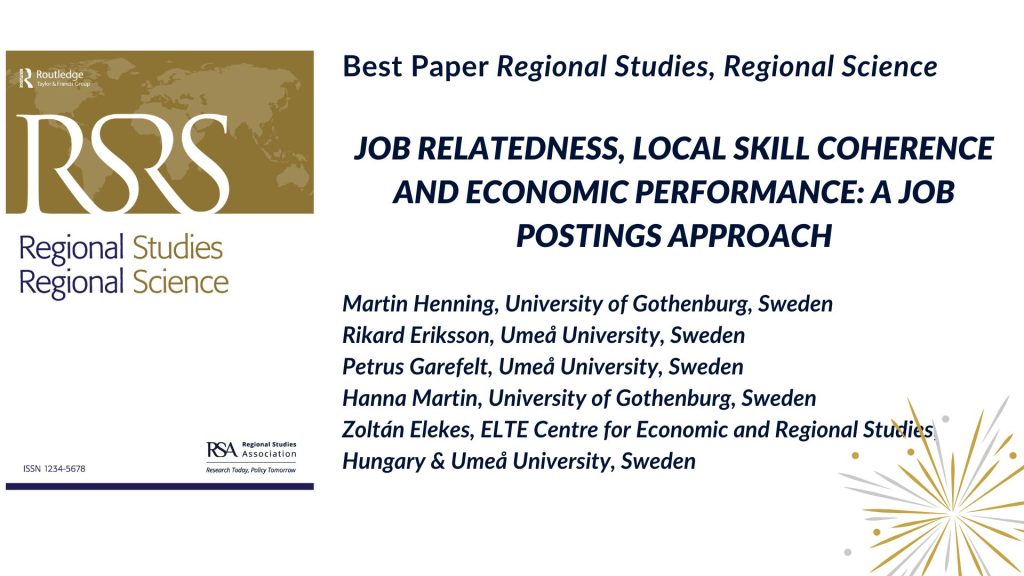 A Regional Studies Association Best Paper Award for Regional Studies, Regional Science 2026 díját Elekes Zoltán és szerzőtársai – Martin Henning, Rikard Eriksson, Petrus Garefelt, Hanna Martin – kapták a 2025-ben publikált ‘Job relatedness, local skill coherence and economic performance: a job postings approach‘ című tanulmányért. Az elismerést Louis Yi Liu főszekesztő jelentette be; az […]